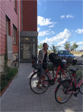 Amanda hämtar två små cykelhjälmar. Vi tar oss ut längs med Södra Fiskehamnen och stannar till vid förskolan.