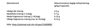 I tabellen nedan ser du hur mycket kolhydrater som rekommenderas beroende på träningens intensitet (låg-hög) och träningsmängd per dag: