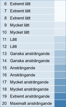 Borgskalan: Borgskalan är ett sätt att mäta träningsintensiteten genom upplevd ansträngningsnivå. Tröskeltempot ska ligga på ca 15-16 på skalan.