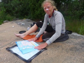 Vi tog det lugnt de första dagarna och paddlade bara kortare sträckor. Att glida förbi stränderna, förbi sommarställen och fina öar, uppleva väder och vind var att känna den totala friheten. Vi paddlade det vi kunde, orkade och hade lust med, letade sedan upp härliga släta klipphällar där vi slog läger, lagade mat, beräknade sträckor på kartorna och förberedde oss inför nästa dags paddling. Det gick nästan för lätt då vindarna var lätta och solen lös.