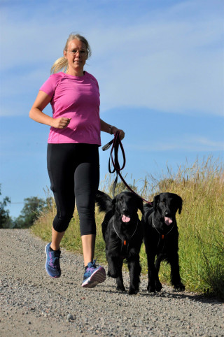 Att jag springer med hundarna har varit så bra för mig – jag blir peppad av deras sällskap. Och de är världens bästa löparkompisar som inte bryr sig om hur långsamt jag springer. Just nu har jag inget behov av att springa utan hundarna. Dessutom slår jag två flugor i en smäll när jag gör en aktivitet tillsammans med dem. Vi springer en snäll och flack runda här i omgivningarna, mest på grusväg och asfalt längs med åkrarna, men också lite stigar mellan åkrarna.