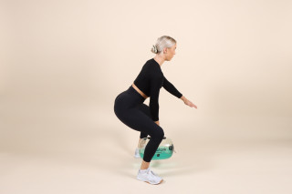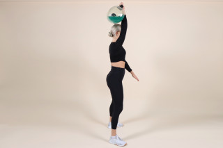 Ta tag i det ena handtaget på din Flowbell med båda händerna, likt en kettlebell. Ställ dig höftbrett isär med benen, böj lite lätt på knäna, tippa över ryggen och svinga sedan vikten kraftigt framåt och uppåt. Repetitionen börjar om när du kommer ned till startposition igen.