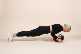 Lägg Flowbell på golvet. Inta armhävningspositon men istället för att placera händerna direkt på golvet greppar du tag i handtagen. Sänk kroppen upp och ned med hjälp av armarnas kraft. För flås: varje gång du kommer upp i utsträckt läge med armarna hoppar du till huk och vidare till ett upphop, med Flowbell fortfarande fast i greppet (tänk burpee).