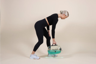 Håll i Flowtank Dumbbell-handtaget och gå ned i en burpee-position, låt Flowtank Dumbbell ligga antingen framför eller alldeles bredvid dig. Res dig från liggande läge till en benböjsposition, vidare till en sving och sträck upp Flowtank dumbbell över huvudet. Repetitionen börjar om när du går ned för att lägga dig på mage igen.