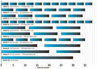 Vecka 1: 10 x 3 minuter med 20–60 sekunders aktiv vila.