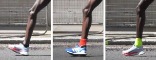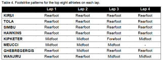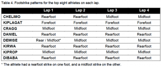 Av de 70 fullföljande löparna i herrarnas lopp kunde man på sista varvet se att 67 procent var hällöpare, 30 procent landade på mellanfoten och 3 procent landade på framfoten.