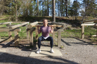 Gör så här: Placera dig så att du har stången på axlarna eller lite under- det som känns bekvämt. Ställ dig höft-eller axelbrett mellan fötterna. Ta ett djup andetag och gör ett knäböj genom att fälla i höften och böj knäna.