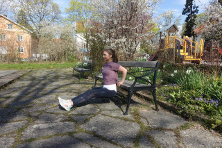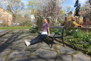 Gör så här: Sätt dig på en bänk, placera händerna axelbrett med fingrarna framåt på kanten av bänken. Lyft rumpan från bänken, böj armbågarna och sänk kroppen ner mot marken. Pressa dig sedan upp igen.
