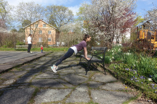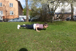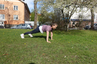 Tänk på: Armhävningarna kan du även göra mot en husfasad eller mot en bänk beroende på din nivå – ju högre upp du har armarna desto lättare blir övningen. 3x10