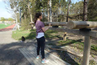 Tänk på att aktivera coren, vilket du kan göra genom att vinkla benen fram. Ibland är även den lättaste stocken lite för tung. Har du träningskompis med dig – låt hen hjälpa till att lyfta stocken lite lätt.