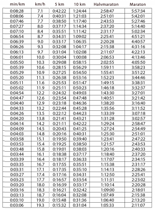 Här nedan har vi en tabell där farter finns omräknade. Av bara hastigheten (häpp!) har vi också i tabellen nedan räknat ut vad farten i kilometer i timmen kommer att ge dig för sluttid på 5 kilometer 10 kilometer, halvmarathon, eller maraton.