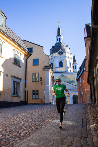 Det här är sista reportaget i serien ”Livet och löpningen med:” där vi träffar stadsdelsambassadörerna för Ramboll Stockholm Halvmarathon 2022. Dagens huvudperson skrev i sin ansökan att ”jag ÄR er givna ambassadör för Södermalm” och det är svårt att säga emot henne. Sarah Skinner levde sina första 27 år i stadsdelen och har bott i lägenheter på Bondegatan, Kocksgatan, Lundagatan och Ölandsgatan. När vi skulle bestämma tid och plats för fotografering och intervju föreslog hon under Bajen-marschen som går från Medborgarplatsen till Tele 2 Arena i samband med herrarnas hemmapremiär i allsvenskan. När det dessvärre inte gick föreslog hon Kvarnen, klassiskt hak på Södermalm. Till slut sågs vi vid Götgatsbacken en solig kväll i april, tog foton runt om på det hon kallar för ”rätt sida” Södermalm, för att sedan vandra ner till Kvarnen och fortsätta samtalet. Vi hann knappt slå oss ned innan en av killarna från Bajen-podden, som spelas in på bordet bakom oss, trillar förbi för att prata med Sarah. Vid tidpunkten för intervjun leder Hammarby herrallsvenskan och stämningen bland supportrarna är mycket god. Så ja, ni hör ju. Hon ÄR Södermalm och det är som ”bajare” hon identifierar sig och så har det alltid varit!