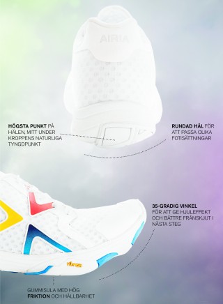 Skon är utvecklad enbart för löpning och fungerar inte att promenera i. Sulan är framtagen av Vibram, världsledare i utvecklingen av gummisulor. Airia passar både professionella löpare och elitmotionärer som kräver de allra bästa produkterna, och de som springer för att må bra.